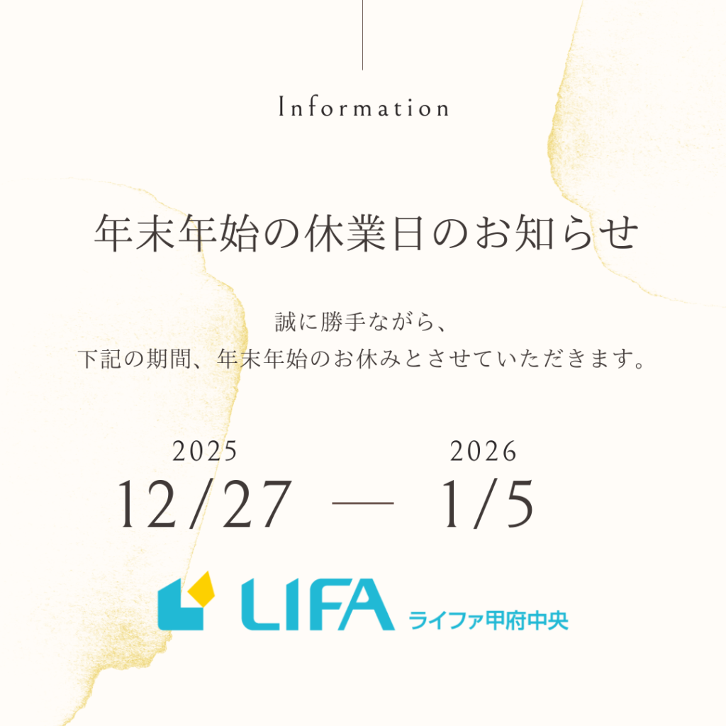 お知らせNEWS 2025.12.26 年末年始休業のお知らせ 本年もご愛顧いただき、誠にありがとうございました。 誠に勝手ながら、12月27日(土)~1月5日(月)まで年末年始休業とさせていただきます。 1月6日(火)より通常営業いたします。 ご理解のほど、よろしくお願い申し上げます。